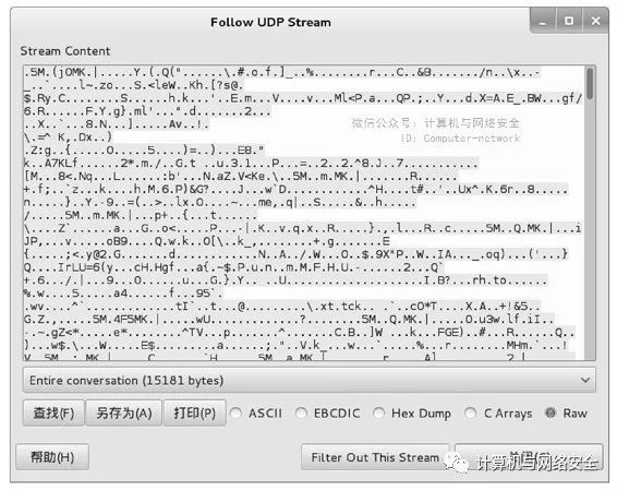在该菜单栏中选择Follow UDP Stream命令,将显示如图19所示的界面。