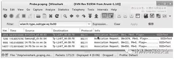 在图8中,客户端首先会扫描无线网络中存在的AP,然后根据获取的AP的SSID,发送探测请求,并得到AP的响应。当接收到AP的响应后,会与其AP进行认证、关联请求和响应。可以通过过滤Association Request类型的包来确定客户端请求连接了某个AP。