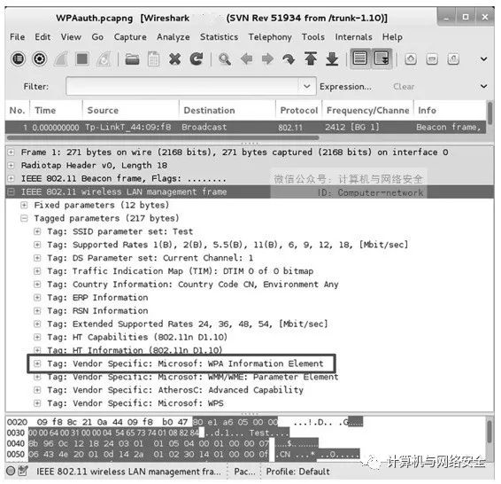 如果AP使用WPA加密方式的话,在AP的包信息中可以看到WPA元素信息。下面是一个使用WPA加密的AP包详细信息,如图6所示。