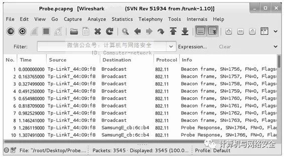 下面以Probe.pcapng捕获文件为例,查看客户端与AP的连接。Probe.pcapng捕获文件如图10所示。