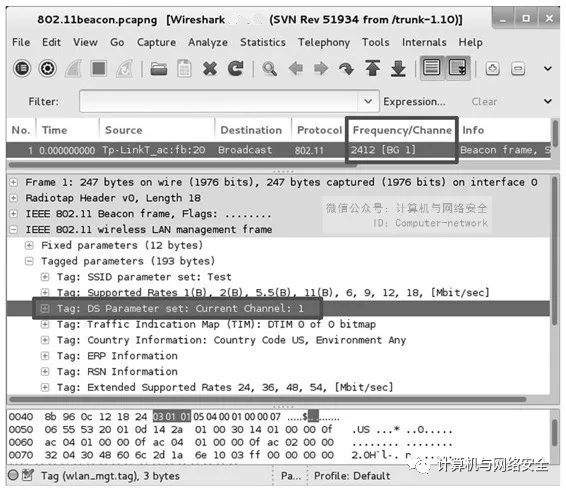 在Wireshark中,可以通过添加列(Frequency/Channel)的形式,很直观地查看到每个AP工作的信道。也可以查看包的详细信息,在802.11管理帧信息中查看AP的工作信道及其他参数,如图5所示。