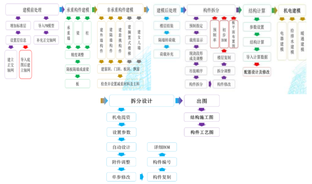 最后在交付结算阶段,施工模块根据产品数据安排PC构件的运输物流以及生成安装指导,财务模块进行会计处理及结算;生产模块审查制造的生产率。