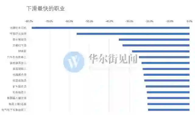 其中损失最为惨重的内燃机车行业,几乎要被高铁新技术全面挤压殆尽,未来十年预计薪资水平将大跌78.6%。制造产业链上,从铸造模具到金属浇铸再到电气设备装配维修,预计薪资水平全线重挫逾20%。