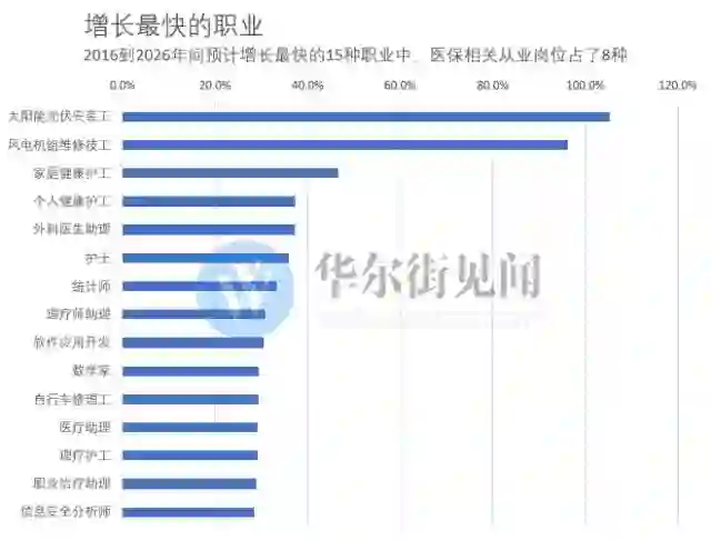 在名列前茅的15种职业当中,有多达8种岗位与医疗保障行业息息相关。2016年个人健康护工的中位数年薪为21920美元(约合14.5万人民币),而外科医生助理的薪资水平则高达101480美元(约合67.4万人民币)。未来十年这些医保相关岗位大都将迎来逾30%的薪资增长。随着美国60年代婴儿潮一代人逐渐步入晚年,夕阳产业的增长潜力不可估量。