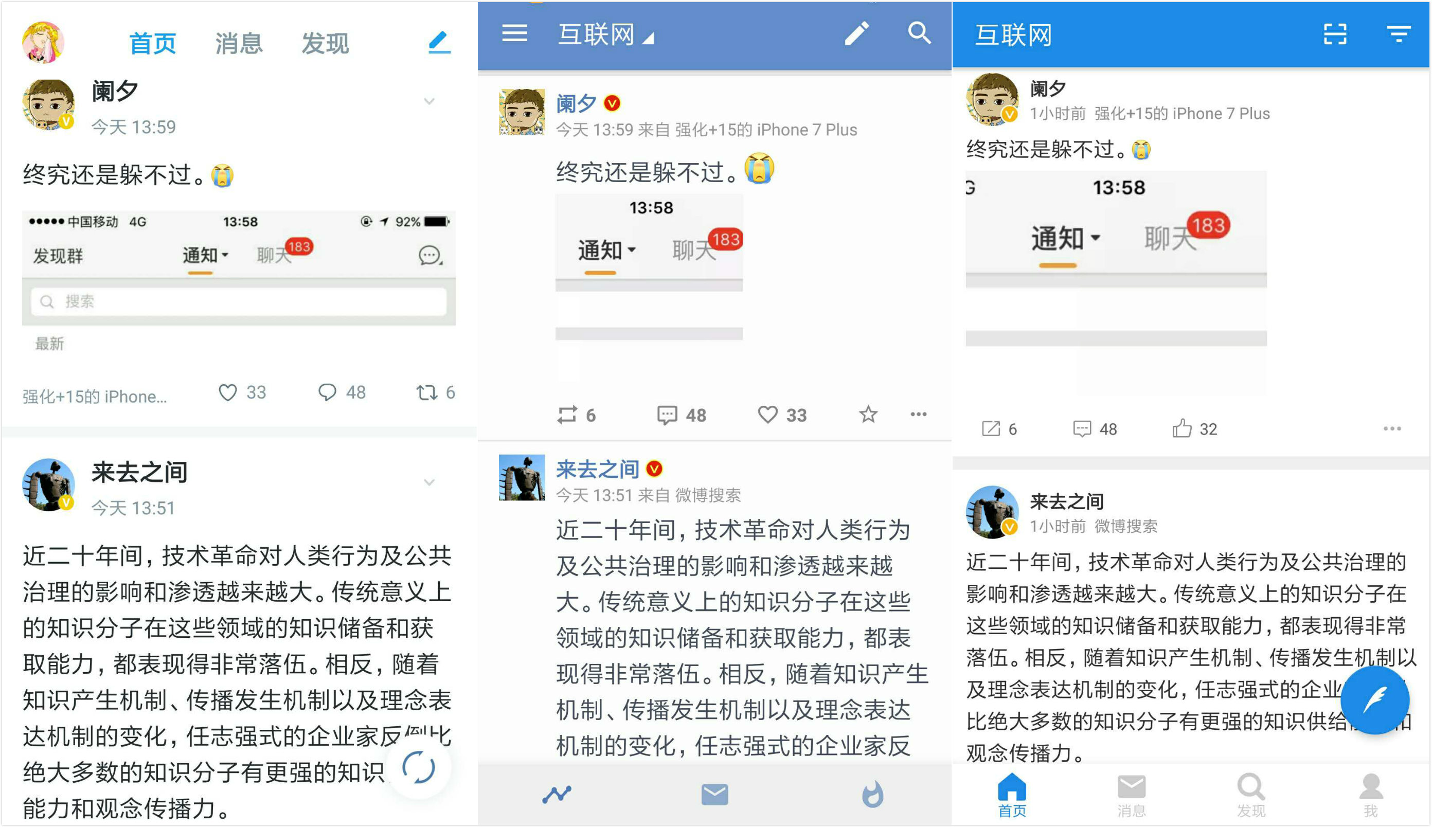 当然了,任何时候都有一批先行者,前赴后继为广大人民群众造福利,用各种黑科技绕过新浪接口限制,提供差强人意的解决方案。先说下背景,我是安卓党。大概2014年左右,因为实在忍受不了微博官方App,我下载了当时市面上几乎所有微博第三方客户端。