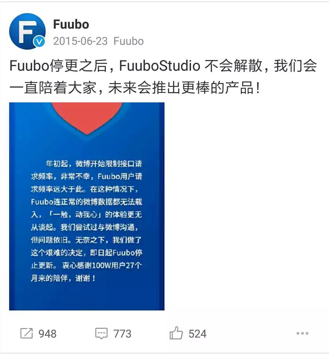 当时也冒出一些惊为天人的第三方微博客户端。iOS端最流行的是Yibo、Moke和VVebo,Andriod端基本上是Fuubo和四次元二分天下。现在这些客户端基本已停止更新,只做原有功能维护。若想继续使用,你大概率要忍受(包括但不限于)这些缺陷:经常性重复授权,无法私信、点赞、搜索,用户关注数、显示不全,偶尔卡顿和闪退……