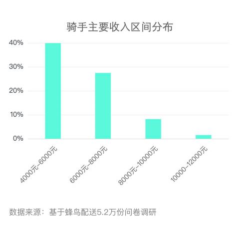 据《报告》统计,蜂鸟骑手收入主要集中在4000—8000元(包含兼职与专职骑手),超过了2017年全国城镇私营单位就业人员月均薪资3813.4元。在河南,做骑手的工资甚至比2017年当地城镇私营单位就业人员的工资高出24%。