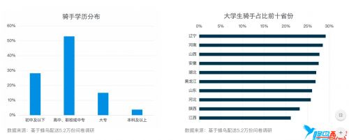 外卖骑手的学历主要集中在高中、职校和中专。蜂鸟骑手的学历也在逐年走高。近20%骑手为大学本科或专科生,其中辽宁省、河南省拥有大学学历的骑手占比全国领先。
