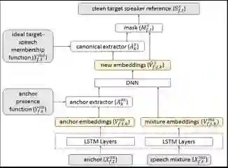 同样入选 Interspeech 2018 的论文《从单通道混合语音中还原目标说话人的深度提取网络(Deep Extractor Network for Target Speaker Recovery From Single Channel Speech Mixtures)》提出了一种深度提取网络(如下图所示),可在规范的高维嵌入空间中通过嵌入式特征计算为目标说话人创建一个锚点,并将对应于目标说话人的时间频率点提取出来。