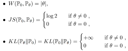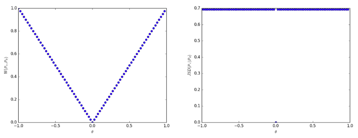 可以看到当 θ 趋近于 0 时,在 Wasserstein 距离衡量下,P1 会趋近于 P0。而其他距离在两个分布不重叠的时候是常量,在两个分布重叠时有一个突变。所以在低维流形上学习概率分布时,可以通过 EM 距离进行梯度下降,而不能通过 JS 距离,因为它作为 loss function 是不连续的。