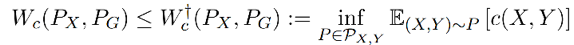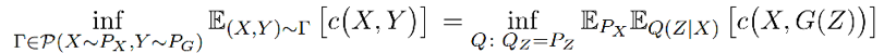 这样就可以将 OT 距离的从找在同一个空间的两个随机变量(分别服从 Px 和 Pg)的某个联合分布转变成了,对 Px 找一个条件分布(也就是 encoder),使边缘概率与先验概率 Pz 相同。