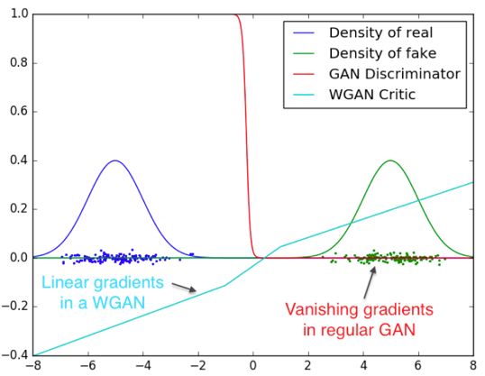 WGAN 的提出是为了克服普通 GAN 出现的梯度消失的问题。Wasserstein 距离与 JS 散度,KL 散度的区别在于,这个距离在两个分布不重叠的时候也是连续的。