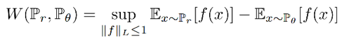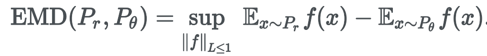 在这里 K=1,也就是说 f 的导数不能超过 1(如果 K 取 k 的话,求得的距离则是 k 倍的 EM 距离),限制了 f 不能改变得太快,在这个前提下,找到 f 使最大,这个上确界(supremum)即为 Wasserstein 距离。f(x) 就可以用 nn 来拟合了,类似于普通 GAN 的判别器一样。