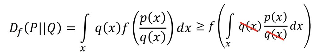 其中 f(x) 可以是任何满足 1. f is convex 2. f(1) = 0 的函数。可以证明,当 P 和 Q 完全相同,也就是说取任意的 x,都有 p(x) = q(x),Df(P||Q)=0。当 P 和 Q 有差异时,由于 f 是 convex 的: