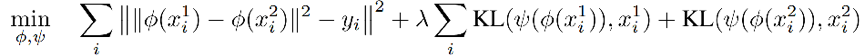 DWE 方法如图所示,从一个数据分布中得到两个采样,分别作为 encoder Φ 的输入,然后通过在 embedding 层使欧氏距离的平方模仿 Wasserstein 距离,用另一个 decoder 网络 Ψ 重构输入的图片,用 KL 散度计算重建误差(选择 KL 散度是因为 x 分布)。训练的目标函数为: