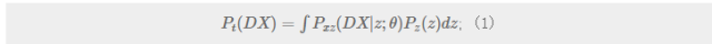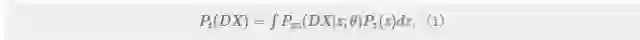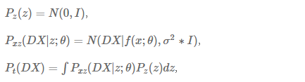 其中,Pxz(DX|z;θ)是我们新定义的概率密度函数,我们前面知道f是将z映射成x,而x又与DX有某种直接的关系,这个直接关系可以表示成Px(DX|x),那么Pt(DX)=∫Px(DX|x)g(x)dx