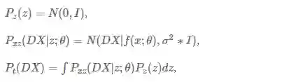 假设有两个变量,z∈ZS 和 x∈XS,存在一个确定性函数族f(z;θ),族中的每个函数由θ∈Θ唯一确定,f:ZS×Θ→XS,当θ固定,z是一个随机变量(概率密度函数为Pz(z))时,那么f(z;θ)就是定义在XS上的随机变量x,对应的概率密度函数可以写成g(x)。
