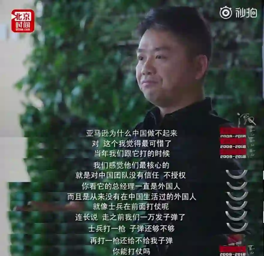 2018年,刘强东做客吴晓波的《十年二十人》节目谈及亚马逊,在竞争的过程中,他发现亚马逊最核心的弱点,就是美国管理者对中国团队缺乏信任。这种信任问题,将亚马逊的中国电商业务推向了失败,刘强东直言“可惜”。