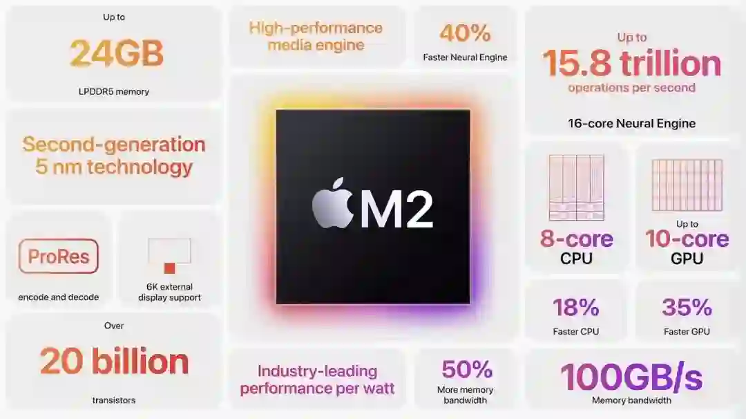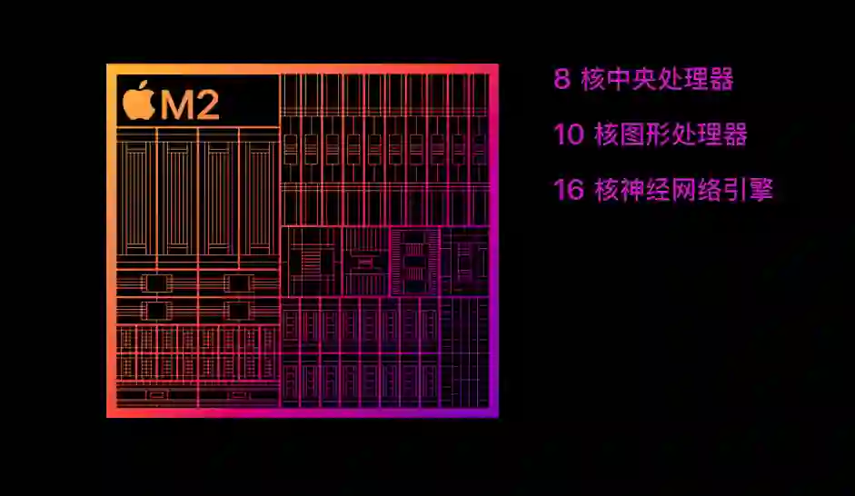 值得一提的是,苹果 M2 芯片并未进行制程工艺上的升级,依然采用与 M1 相同的 5nm 工艺制造。根据发布会上苹果给到的数据,由于采用了新的 10 核 GPU,M2 的 CPU 性能比 M1 快 18%,图形性能提升 35%。M2 还提供高达 24GB 的内存,而 M1 仅提供 8GB 和 16GB 的内存。