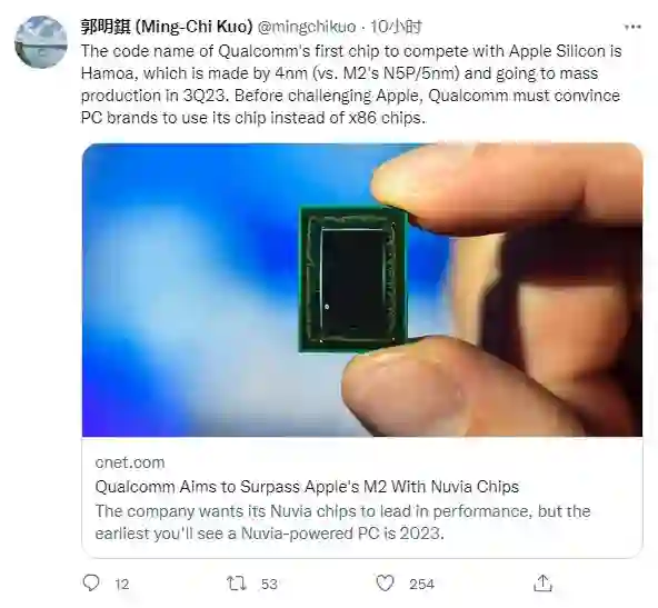今日,天风国际证券分析师郭明錤在社交平台发布推文表示,高通将推出代号为 Hamoa 的芯片与苹果 Apple Silicon 芯片对标全力竞争。高通 Hamoa 芯片将采用 4nm 工艺,预计 2023 年第三季度量产。但是高通在与苹果竞争前,还需要说服各大电脑厂商换用 X86 架构芯片转投 Arm 架构芯片。