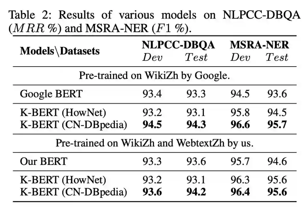 可以看出,K-BERT 相比于 Google BERT,在开放领域的任务上有一点微小的提升,但是提升不是很明显。可能的原因在于开放领域的任务并不需要背景知识。