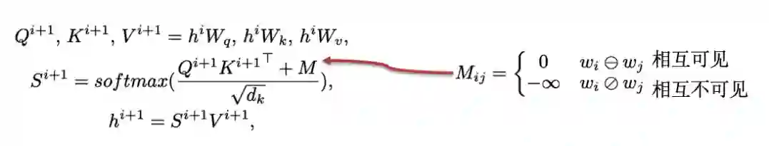 有了可见矩阵以后,可见矩阵该如何使用呢?其实很简单,就是 Mask-Transformer。对于一个可见矩阵 M,相互可见的红色点取值为 0,相互不可见的白色取值为负无穷,然后把 M 加到计算 self-attention 的 softmax 函数里就好,即如下公式。
