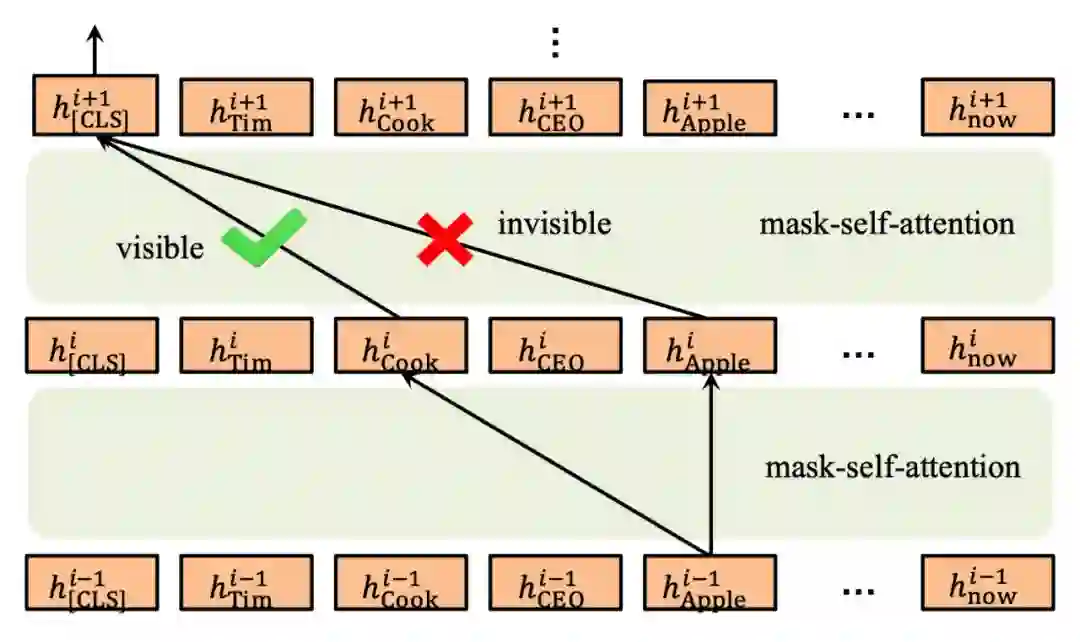 显然,平铺以后的句子是杂乱不易读的,K-BERT 通过软位置编码恢复句子树的顺序信息,即“[CLS](0) Tim(1) Cook(2) CEO(3) Apple(4) is(3) visiting(4) Beijing(5) capital(6) China(7) is_a(6) City(7) now(6)”,可以看到“CEO(3)”和“is(3)”的位置编码都 3,因为它们都是跟在“Cook(2)”之后。