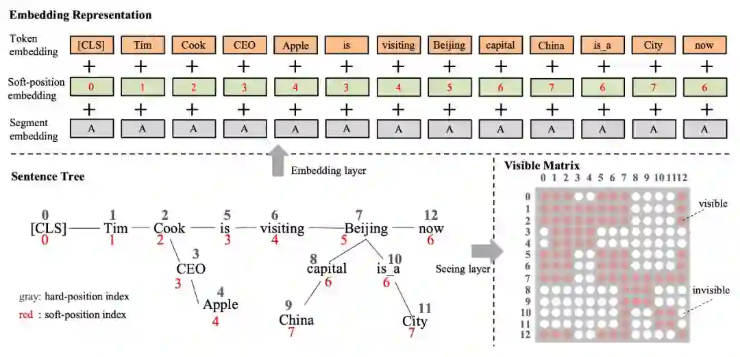 得到了句子树以后,问题出现了。传统的 BERT 类模型,只能处理序列结构的句子输入,而图结构的句子树是无法直接输入到 BERT 模型中的。如果强行把句子树平铺成序列输入模型,必然造成结构信息的丢失。在这里,K-BERT 中提出了一个很巧妙的解决办法,那就是软位置(Soft-position)和可见矩阵(Visible Matrix)。下面我们详细看看具体的实现方法。