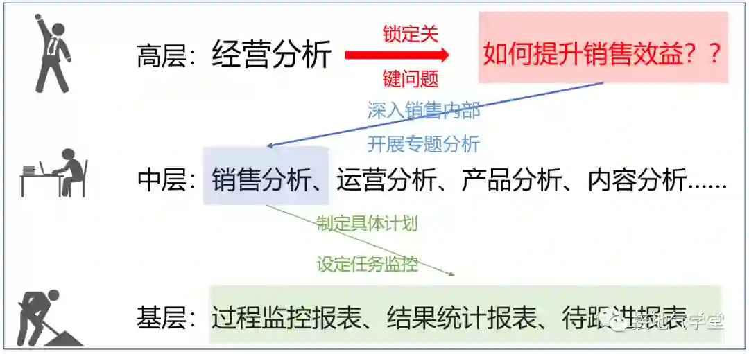 在整个数据分析体系里,经营分析是最顶层的分析,它主要解决两个宏观问题:企业整体经营状况是否达成预期?企业的主要经营手段是否奏效?再细节的分析,则交给相应部门,做专题分析(如下图)。