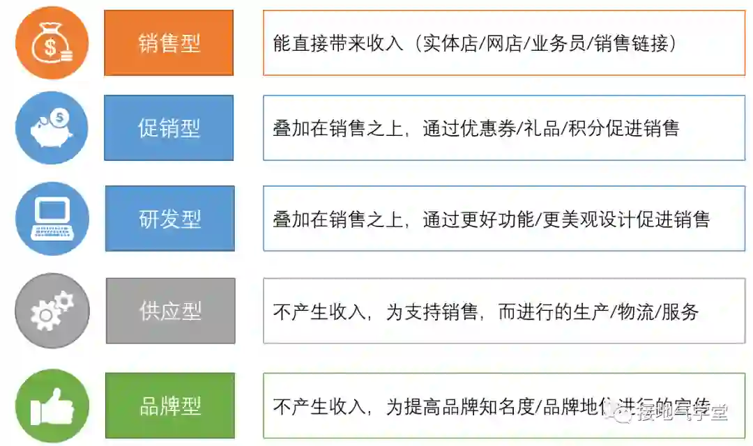 每一个业务,要讲清楚自己工作与营收指标关系,常见的有五大类,可以参考(如下图)