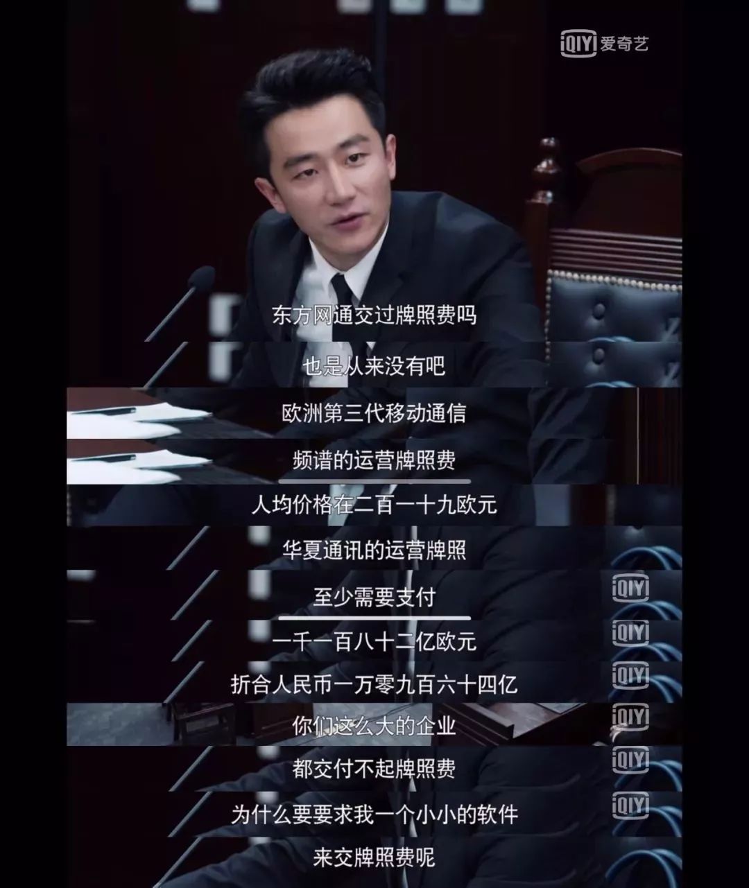 剧情还原:黄轩扮演的郭鑫年就牌照费问题向运营商发难,并列举了欧洲运营商购买3G频段时所花费的天价资金,其观点是:如此天价“牌照费”中国电信运营商都付不起,凭什么要小小的创业公司支付?