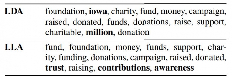 解释性 LLA和LDA都能对全局主题做出揭示,LLA 总结出的要更加明确。如下表,LDA 会总结出“Iowa”,仅仅因为它在不同的文档中都出现了;而 LLA 追踪短期动态的特性可以让它在句子的不同位置正确切换主题。