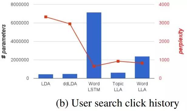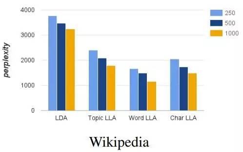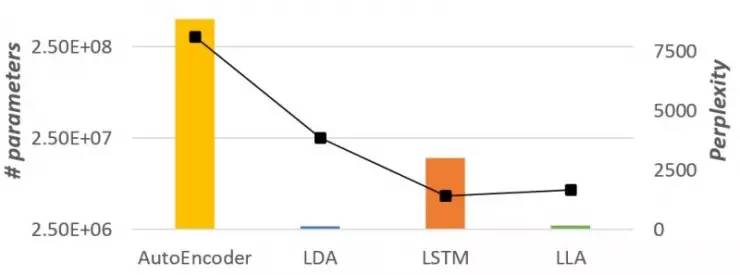 柱状图是参数数量,折线是复杂度。根据图中示意,在基于 Wikipedia 数据集的语言建模任务中,LLA 比 LDA 的复杂度更低,参数数量也比 LSTM 大大减少。