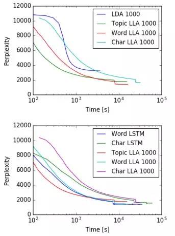收敛速度 LLA的收敛速度并没有什么劣势,比快速LDA采样也只慢了一点点。不过基于字符的LSTM和LLA都要比其它的变体训练起来慢一些,这是模型本质导致的,需要在单词和字符层面的LSTM都做反向传播。
