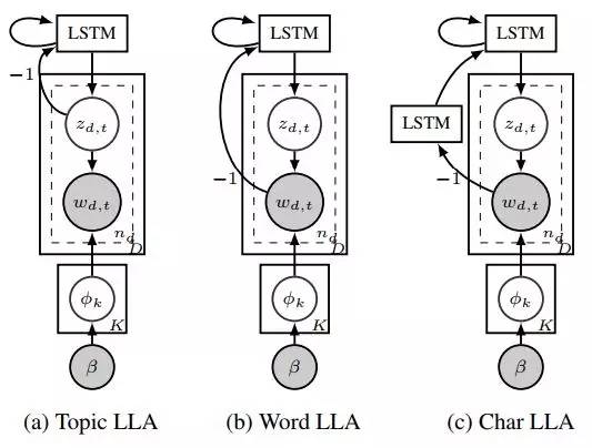 在这篇论文中,作者们提出了 Latent LSTM Allocation(潜LSTM分配,LLA)模型,它把非序列LDA的优点嫁接到了序列RNN上面来。LLA借用了图模型中的技巧来指代话题(关于一组有关联的词语或者用户行为),方法是在不同用户(或文档)和循环神经网络之间共享统计强度,用来对整个(用户动作或者文档)序列中的话题进化变化建模,抛弃了从单个用户行为或者单词级别做建模的方法。