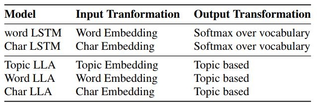 作者们认为,模型直接使用原始文本会比使用总结出的主题有更好的预测效果。所以在 Topic LLA之外,又提出了两个变体 Word LLA 和 Char LLA (前文 a、b、c 三个模型),分别能够直接处理原文本的单词和字符(Char LLA自己会对字符串做出转换,从而缓和 Word LLA 单词库过大的问题 )。