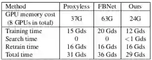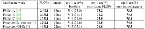 虽然表 4 展示了本文方法的优越性,但是由于搜索空间和训练方法的不同,存在不公平对比的可能性。为直接进行对比,本文采用和 Proxyless NAS、FBNet相同的搜索空间,并在同一设置下再训练已搜索的模型,具体对比结果如表 5 所示: