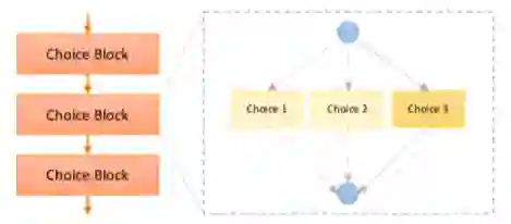 选择单元用于构建一个超网络。图 1 给出了一个实例。一个选择单元包含多个选择。对于本文提出的单路径超网络,每个选择单元一次只调用一个选择。一个路径的获得是通过随机采样所有选择单元实现的。