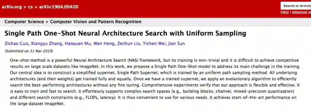 今天,旷视科技首席科学家孙剑团队发布论文Single Path One-Shot Neural Architecture Search with Uniform Sampling,首次披露AutoML中的重要子领域神经结构搜索的最新成果——单路径One-Shot模型。