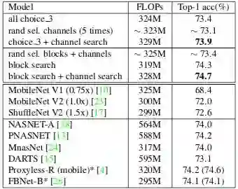 搜索卷积层的通道数非常有挑战,如图 4 所示,本文提出一个全新的选择单元用于通道数搜索,并首先在基线结构 “all choice 3”(见表 3)做了评估,结果如表 4 (第一部分)所示;为进一步提升精度,本文对构造单元和通道做了联合搜索。结果如表 4(第二部分)所示。