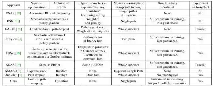 单路径超网络、均匀采样训练策略、基于进化算法的模型搜索、丰富的搜索空间设计,上述多种设计使得本文方法简单、高效和灵活。下表给出了本文方法与其他权重共享方法的一个全方位、多维度对比结果。