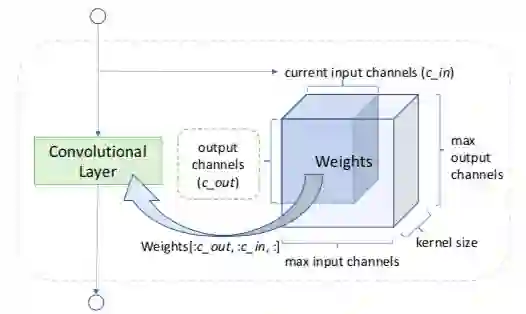 通道数搜索。选择单元旨在搜索一个卷积层的通道数。其主要思想是预先分配一个带有最大通道数的权重张量。在超网络训练期间,系统随机选择通道数并分割出用于卷积的相应的子张量。详见下图。
