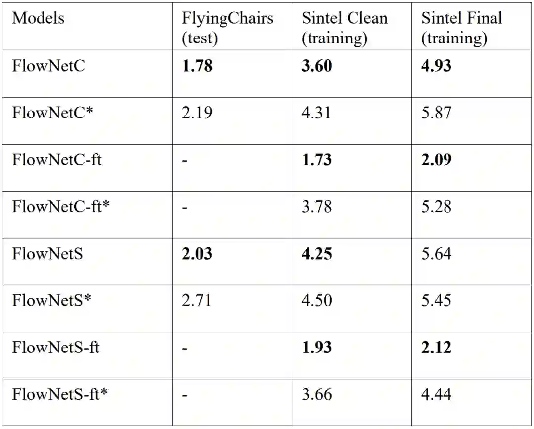 FlowNetC 和 FlowNetS 模型在 FlyingChairs 数据集上的预训练模型和 Sintel 数据集上的 Fine-tune 模型,在 Sintel (training) 数据集上的 Average EPE 评价结果,均高论文(*)公布结果: