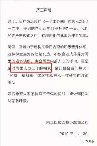阿里今天早上发了严正声明,表示“阿里一直着力于构建完善而合理的职级晋升体系,这种肆意妄为的瞎编乱造,不仅会造成外界对阿里的诸多误解,也会(造成)阿里内部人心的浮动,更是对阿里人力工作的嘲讽。”