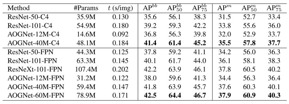 MS-COCO物体检测和实例分割数据集。MS-COCO是目前最通用的物体检测和分割的数据集。我们在最新的maskrcnn-benckmark的代码框架[24,25]下测试了AOGNets,如表2所示,AOGNets取得了比ResNets和ResNeXts都好的性能。