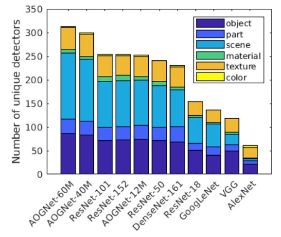 表1. 上:在ImageNet-1000上Top-1 和Top-5错误率(越小表示性能越好)的比较(224x224分辨率下Single-model single-center-crop的性能);下:基于network dissection 方法的模型可解释性比较。来自论文[1]。
