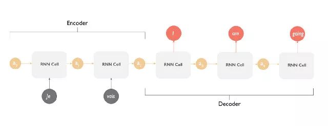 当需要处理输入和输出序列的数量不一致时,我们便可采用多对多架构的另一种版本。而机器翻译任务就是这样的一个应用实例:输入是原文的一串词语(比如法文),而输出是译文的一串词语(比如英文)。这个架构有两个不同的模块:编码器和解码器。前者接受输入的句子,将其映射成内部状态表征,然后将其传给后者,以供其生成输出的句子。