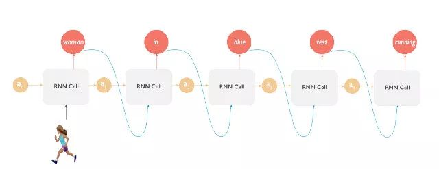 上图显示了输入是一个女性跑步的表情符号,而输出则是预测得到的一串词语:「woman in blue vest running」。