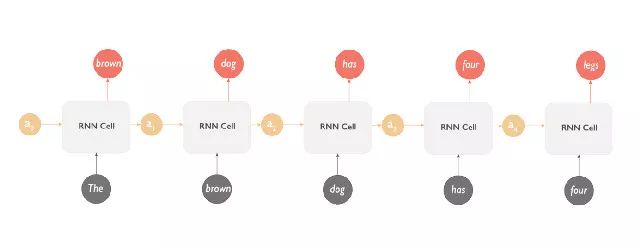 如上图所示,文本生成器的输入是一串词语,输出则是由预测得到的下一个词所组成的一串词语:「brown dog has four legs」。