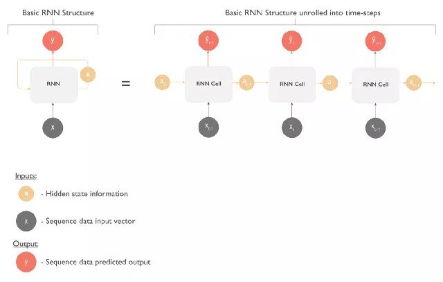 由上文可知,RNN 能够通过对整个序列重复同样的过程,从而做出预测。左下图显示了循环网络的基本结构。它同时接收序列数据输入向量(x)和隐藏状态信息(a),然后使用二者去预测序列数据的输出。